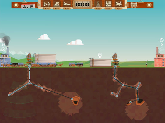 在小镇拍卖会上租土地,寻找石油。建造钻井设备,创建一个高效的管道网络,挖出石油并将它们存储在筒仓中。在最佳时间出售石油,使利润最大化。而后,购买镇上的基本升级以应付岩石、天然气和冰块。在竞标中获得比竞争对手更多的股份,成为新市长。