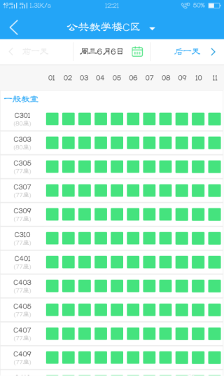 7、你也能够点击选择教学楼,挑选一处舒心的环境,随后系统便会展示出教室,正在上课的教室显示为灰色,空闲的教室则显示为绿色。